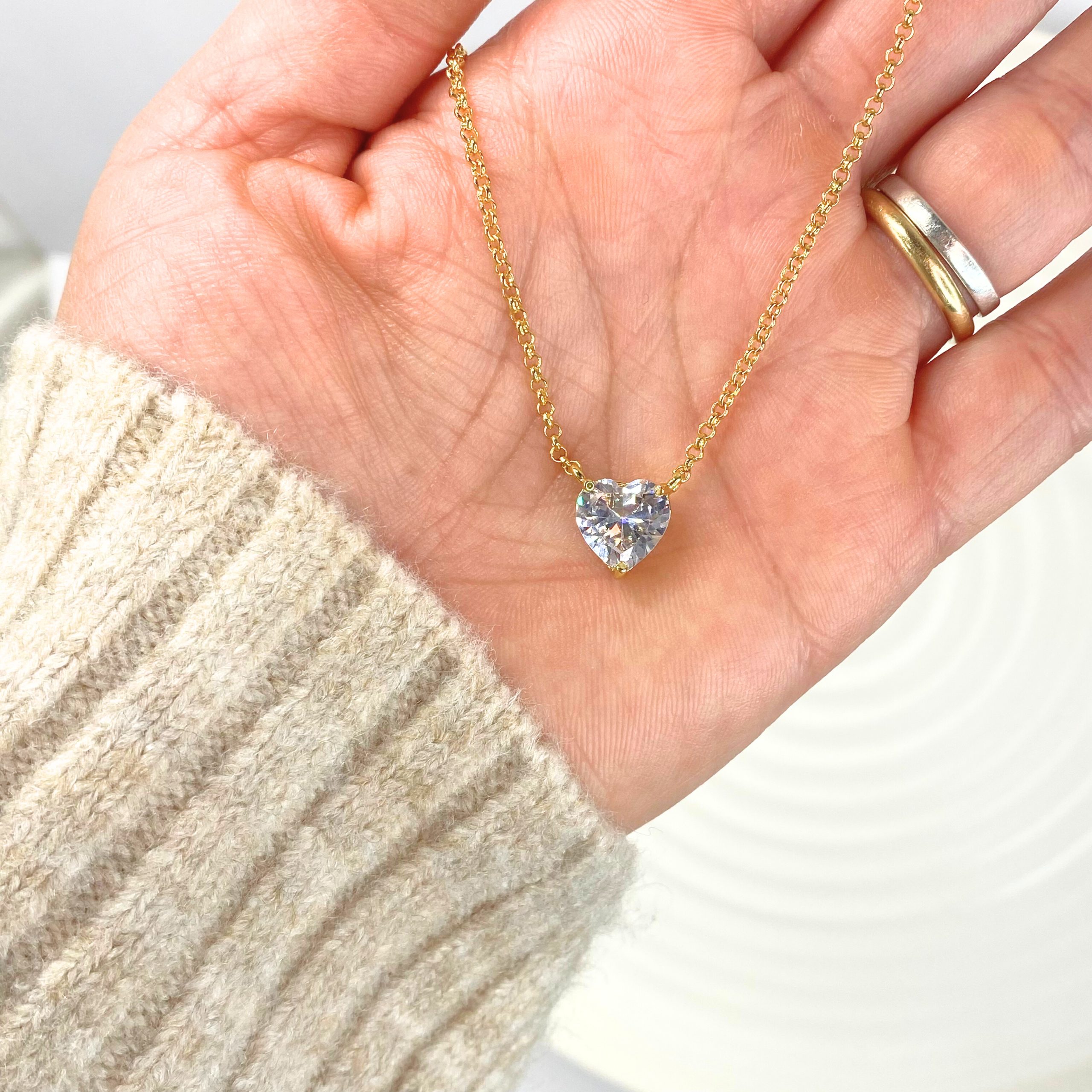 At its center, a heart-shaped pendant adorned with a large crystal stone captures light beautifully, adding brilliance and elegance without overpowering the piece. The balance between the polished gold tone and the crystal detail creates a refined accessory suitable for any occasion.